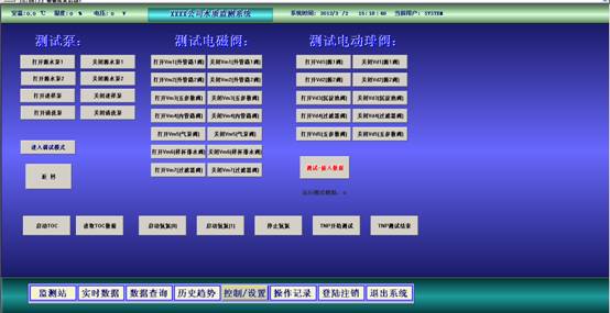 在系統(tǒng)構(gòu)建的前期,設(shè)備還沒有完全裝配結(jié)束時,系統(tǒng)還不能連續(xù)穩(wěn)定的運(yùn)行。此時經(jīng)常需要對某些設(shè)備進(jìn)行單獨的調(diào)試起停。在調(diào)試畫面中,可對源水泵,電動閥,電磁閥,各個測量儀器進(jìn)行完全控制。待各設(shè)備調(diào)試成功后,正式啟動系統(tǒng),周期性運(yùn)行。