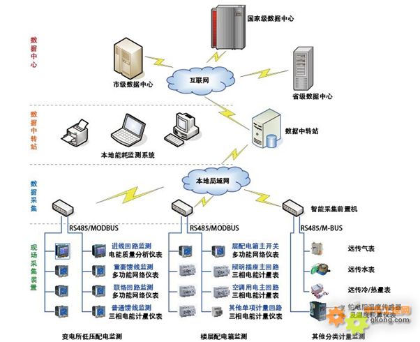 用電類:采集采暖、鍋爐、空調、制冷、照明、辦公、電梯、水泵、風機、通風機等耗電設備的用電信息。主要監測其用電量,對于大耗電設備監測其電流、電壓及功率因數等信息。