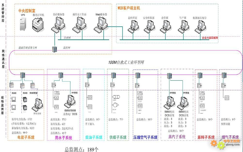 系統管理層是能源管理系統的最高管理層。系統管理層的全部設備安放在中央控制室內。配置一臺監控服務器、一臺操作工作站、一臺WEB 服務器、通訊設備、激光打印機、UPS 等。數據服務器采用高性能計算機,能源管理軟件采用專業的監控組態軟件。該層完成接受現場監測層和DCS 系統上傳的實時數據,并對這些數據進行分析、轉換、存儲,并以數字、曲線、報表等形式顯示在屏幕上。能源管理系統須采用分層分布式網絡結構,應具有良好的可靠性與實時性。監控軟件應基于Windows 2000/2003/XP 中文操作系統,采用客戶機/服務器模式的分布式網絡結構,標準化、網絡化、功能分布的體系結構;具備軟、硬件的擴充能力;支持系統結構的擴展和功能的升級。同時,該層可以提供標準的網絡接口和通信協議,實現與其他系統的聯接;系統管理層通過OPC Server 與其它集成系統進行數據交換。具備與山東淄礦集團內部計算機網絡、信息管理系統(MIS)、生產管理系統(如:DCS)、建筑物集成管理系統(BMS)等系統的聯網,與其它接口可采用OPC Server/Client 模式。