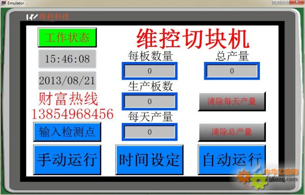 維控觸摸屏LEVI700L構成控制系統。該系統分為手動和自動功能。自動運行狀態是要先設置好相關參數,點擊啟動即可。手動運行狀態全部是點動控制。還可以監控輸出輸入的狀態。 二、維控觸摸屏主要畫面