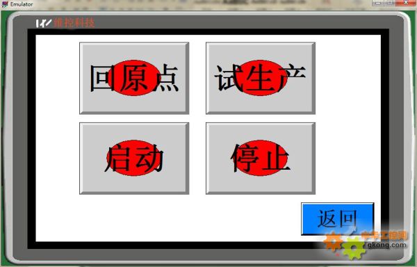 2、自動運行頁面 自動運行頁面有4種工作方式,包括回原點,試生產 啟動和停止。