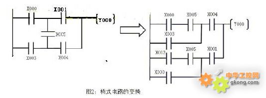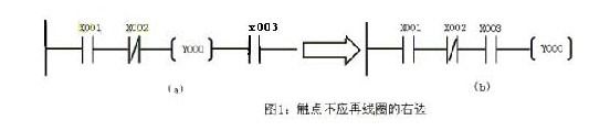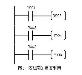 圖(b)中,X001和X002接點控制輔助繼電器M000,X003~X005接點控制輔助繼電器 M001,再由兩個繼電器M000,M001接點的并聯組合去控制線圈Y000。這樣邏輯關系沒變,卻把雙線圈變成單線圈。 |