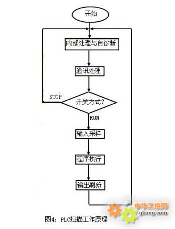 PLC的CPU采用循環掃描的工作方式。一般包括五個階段(如圖所示):內部診斷與處理,與外設進行通訊,輸入采樣,用戶程序執行和輸出刷新。當方式開關處于STOP時,只執行前兩個階段:內部診斷與處理,與外設進行通訊。