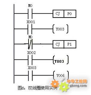 程序分析:M0閉合,程序跳至P0處(不執行X001語句),M0常閉斷開,CJP1不會發生,執行下一語句。此時,Y003將X002狀態進行驅動。M0斷開時,程序順序執行并按X001的狀態對T003進行驅動,M0常閉閉合,跳至P1按X003狀態對 Y004進行驅動,即跳過了X002驅動Y003的語句。可見,在同一時刻,Y003驅動只有一個可以發生。此時,雙線圈利用是可以的。