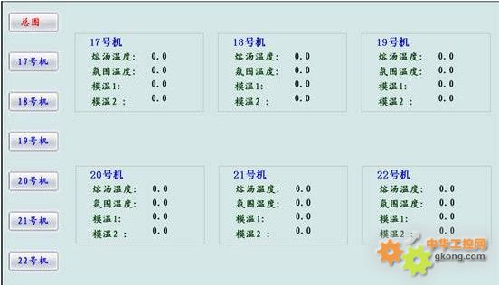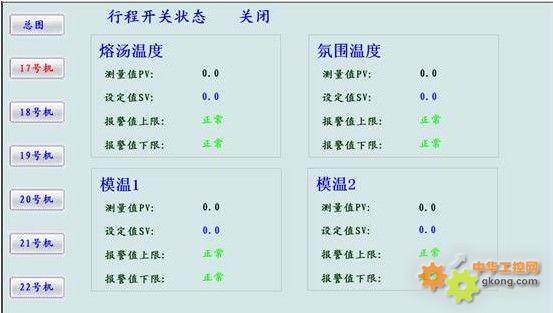 實時顯示六塊溫控表采集上來的溶湯溫度,氛圍溫度,模溫1,模溫2。在“總圖”運行界面左邊有六塊儀表的導航按鈕 ,點擊各個儀表的導航按鈕可以進入到各個儀表數據采集界面,如下圖。在這里可以查看行程開關狀態以及各個采集溫度的測量值,設定值,以及報警狀態。
