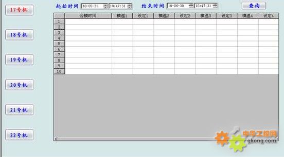 數據查詢界面主要功能是在行程開關動作的時候把相關的溫度值和設定值保存在ACCESS文件里,然后通過自由報表顯示出來。選定查詢的起始時間和結束時間就可以查詢出時間范圍內保存的數據。