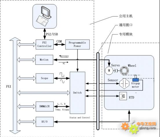 三.系統(tǒng)設計 傳感器的動、靜態(tài)參數(shù)測量是測試系統(tǒng)的核心內(nèi)容,系統(tǒng)需要有較高的測試精度和重復精度,對某些測試參數(shù)需要根據(jù)實際情況自定義測試算法。虛擬儀器技術是以計算機技術為核心的測試測量技術,既滿足上述系統(tǒng)的軟、硬件要求,又具有很強的擴展性,故選用虛擬儀器作為開發(fā)的技術手段。此外,系統(tǒng)需要提供IO接口對外部氣缸動作進行控制,需要運動控制卡對轉速進行精確控制,是一套“機”、“電”、“軟”結合的柔性測試系統(tǒng)。 系統(tǒng)原理如圖1示,傳感器測試系統(tǒng)的核心是PXI系統(tǒng),主要由控制器、萬用表模塊、示波器模塊、數(shù)字I/O模塊、矩陣開關模塊、運動控制模塊等組成。PXI系統(tǒng)內(nèi)部通過PXI總線進行數(shù)據(jù)傳輸。 控制器通過顯示器、鼠標、鍵盤實現(xiàn)人機交互。 萬用表模塊和示波器模塊通過矩陣開關的切換,實現(xiàn)對被測傳感器的電阻、電流、電感、電容測試。 數(shù)字I/O模塊的功能是對報警系統(tǒng)和指示燈的控制,以及監(jiān)視測試啟動開關、光電傳感器、等的狀態(tài)。 運動控制模塊主要是控制伺服電機的運動,使其帶動目標輪按設定的參數(shù)運轉,激勵被測傳感器產(chǎn)生信號。 矩陣開關模塊配合萬用表模塊及示波器模塊使用,完成傳感器信號、供電電源和間隙信號到不同設備的切換。 此外,通過計算機對電源進行控制,提供被測傳感器的供電要求。