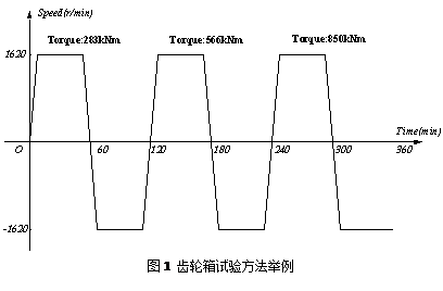 本文描述了基于PXI總線技術的風電測控系統。系統通過直流調速設備控制電機對風力發電機齒輪箱產品進行實際運行環境模擬,并對采集得到的環境參數及噪聲振動數據進行分析,生成檢測報告。運用PXI硬件優越的定時、觸發性能及LabVIEW虛擬儀器軟件開發平臺,簡化并加速了復雜系統的開發過程。運行實時操作系統對復雜的聲音振動分析計算進行資源分流,并保證了系統長期穩定可靠的運行。 風電測控系統將兩個齒輪箱產品放置在步進電機主軸的兩側同時進行檢測,依靠步進電機的帶動模擬齒輪箱實際工作狀況。按照圖1所示,分為三個階段驅動電機運行,第一個階段給齒輪箱加載283kNm的負載,電機首先以1620r/min的轉速正轉60分鐘,然后再以同樣的速度反轉60分鐘,如此重復三次,每次加載不同的負載,第二三階段的負載分別為566kNm、850kNm。電機穩定運行狀態下,檢測環境參數及振動噪聲相關指標,評定齒輪箱產品質量。
