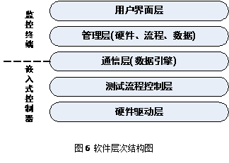 本系統的軟件使用LabVIEW開發。LabVIEW是高效圖形化應用開發環境,結合了簡單易用的圖形化開發方式和靈活強大的編程語言的優勢合而為一。系統分為監控終端程序、嵌入式控制器程序兩部分。 為了保證程序結構的可擴展性和可延續性,系統將整個軟件劃分為如圖6所示的層次結構。以通信層為界,用戶界面層和管理層在程序結構處于監控終端,而測試流程控制層、硬件驅動層屬于嵌入式控制器。通信層為監控終端和嵌入式控制器建立數據引擎和標準接口。
