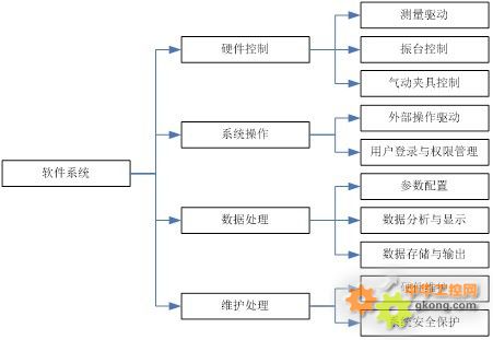 軟件在功能實現上采用模塊化的方式,特定的模塊實現特定的功能,主要組成模塊有測量驅動模塊,振臺控制模塊,氣動夾具控制模塊,外部操作驅動模塊,硬件維護模塊,系統安全保護模塊,用戶登錄與權限管理模塊,參數配置模塊,數據分析與顯示模塊,數據存儲與輸出模塊等,如圖4所示。