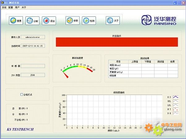 測量驅動模塊主要控制儀器實現測量功能;振臺控制模塊采用閉環控制算法使振臺在不同的振動頻率下都可以有穩定的加速度振動;氣動夾具控制模塊主要實現測試過程中對振臺夾具的動作控制,同時可以控制打標機構等氣動系統的動作;外部操作驅動模塊通過對數字 I/O 端口的監控,完成氣缸各種動作狀態的監視,并通過報警驅動功能,用三色報警燈對測試進程及測試結果進行直觀的指示,同時可利用廢品箱上的光電傳感器實現廢品計數,對廢品進行質量控制;為了生產安全和質量保障的需要,在軟件中設計了專門的用戶登錄與權限管理模塊,可以分配管理員與一般操作者兩種權限,一般操作者只分配操作權限;軟件通過參數配置模塊實現傳感器檢測參數的設定、存儲、加載和保存等功能;檢測過程中,數據分析與顯示模塊會對檢測參數、測試過程、測量數據與波形、最終結果等進行動態、直觀的顯示,同時利用數據存儲與輸出模塊將測試結果實時存儲在Excel文件中,并可通過數據回放功能對數據進行查看;硬件維護模塊實現硬件調試功能,可對各個測量儀器進行維護操作;系統安全保護模塊具備完善的監控功能,實時反饋急停按鈕的狀態,當測試過程中,操作人員按下急停按鈕后,會迅速停止測試過程的各項操作,并將系統設置為急停狀態,等待操作人員的進一步處理。