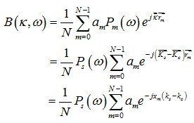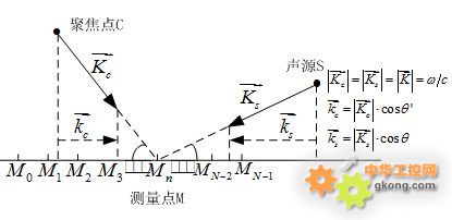 如圖2所示, 是被測聲源面上的任意聚焦點到測量陣列的聚焦波數, 為聲源的入射波數,聲源S聲強為 。波束成形的過程是將陣元測得的聲壓信號在聚焦波數 方向上進行聚焦,即假設聲波是由該聚焦點輻射出來的,進而選擇時延校正因子。這樣聚焦波數 方向上的聲壓輸出為: