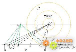 圖3是波數成形算法的一維分析模型,聲源S在 位置,聲強為 ,聲音到達陣列上第m個陣元時,陣元接收到的信號為: