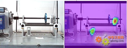 圖6 MFS案例分析 利用振動仿真平臺,設計實驗環境,在轉子軸上懸掛一個外側有螺栓孔的偏心轉子,控制轉速在2400rpm,根據分析,在此仿真環境下,主要的噪聲源是偏心轉子上產生的嘯叫。利用噪聲定位分析系統對仿真環境分析,得到如圖6所示的聲像圖,選擇噪聲分析頻率為4KHz,即轉速的10倍頻處。從圖中可以看出,此刻噪聲主要是由轉子軸上的轉子產生的,而通過連續采集分析發現該聲強周期性的增強,而這一分析結果剛好與事實相符。噪聲定位分析系統就是通過綜合時域及頻域噪聲定位方法,靈活方便地確定故障位置,以及故障產生的異常噪聲的時域、頻域以及倒譜域的聲音特性。為故障診斷提供了一種更直觀、更便捷、更多元化的解決方案。同時,測試系統的可靠性、精確性、適應性、靈活性和拓展性,也正是柔性測試技術所關注的。