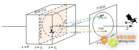 新一代的噪聲定位分析系統,在陣型上從二維平面陣升級到三維空間陣,改進了分析模型(如圖4所示),對空間中的一個觀察平面上不同點的聲音強度進行掃描,繪制出一幅聲強的分布圖。