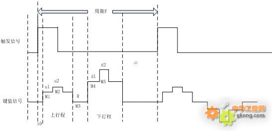 按鈕每次被按下之前都有一個(gè)觸發(fā)信號(hào),觸發(fā)周期T表明在該段時(shí)間內(nèi),按鈕的所有鍵值都要被監(jiān)測一次。上、下行程的兩個(gè)鍵值分為u1,u2,d1,d2,復(fù)位鍵值為R。M1,M2,M3,M4,M5表示對應(yīng)鍵值的位置,t0表示觸發(fā)信號(hào)上升沿到來時(shí)距離按鈕第一個(gè)鍵值出現(xiàn)的時(shí)間間隔。