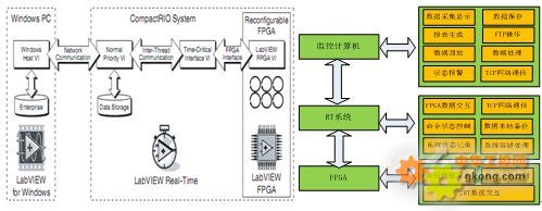 本系統(tǒng)圖形化編程語言LabVIEW[4]作為開發(fā)平臺(tái),它內(nèi)置信號(hào)采集、測量分析與數(shù)據(jù)顯示功能,摒棄了傳統(tǒng)開發(fā)工具的復(fù)雜性,在提供強(qiáng)大功能的同時(shí)還保證了系統(tǒng)靈活性。根據(jù)系統(tǒng)的硬件架構(gòu),軟件部分也由三部分來組成。Windows PC的上位機(jī)軟件部分、CompactRIO System的實(shí)時(shí)操作系統(tǒng)部分和FPGA部分。如圖所示