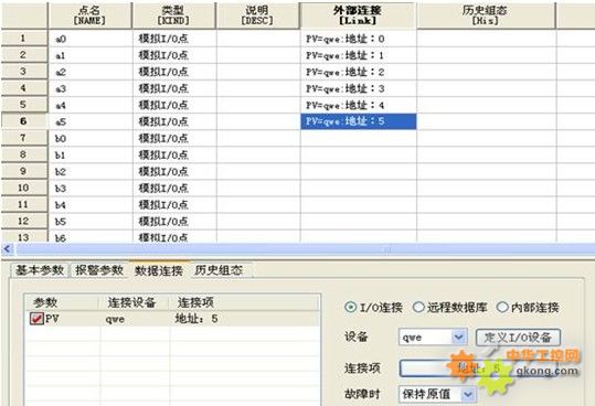 將驅(qū)動程序拷貝到軟件安裝目錄后,進入組態(tài)環(huán)境,建立設(shè)備驅(qū)動。然后進入點組態(tài)界面,建立模擬點并組態(tài)外部連接,連接到新建的設(shè)備名稱,用于LED大屏幕數(shù)據(jù)的下置,點連接項中只需要填入數(shù)據(jù)下置的十進制地址即可。這里需要說明一下,該驅(qū)動只支持寫操作(即數(shù)據(jù)的下置),不支持讀操作(即數(shù)據(jù)的采集)。