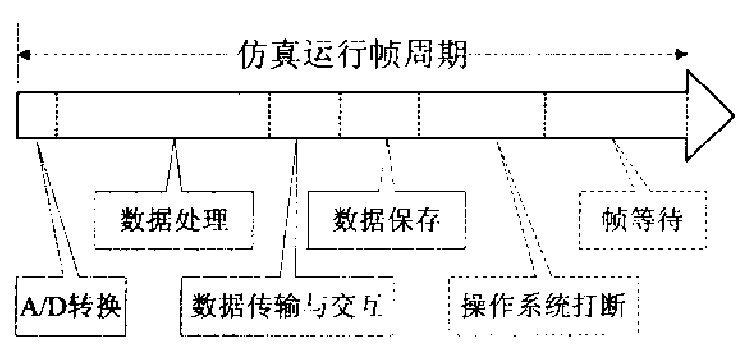 數據的實時采集、處理和交互,是實現閉環仿真實驗的必要前提。而在仿真系統中由于實物(導引頭)的引入,要求仿真的推進應該與實時的外部事件相適應…。因此,數據的采集與處理應該在仿真模型解算要求的時限內完成,從而對數據采集系統的實時性提出了很高的要求。在仿真運行過程中,仿真系統在每一個幀周期內需要完成數據的采集、處理、交互和保存等工作,于是可將仿真運行幀周期大致劃分為六個部分,如圖2所示。