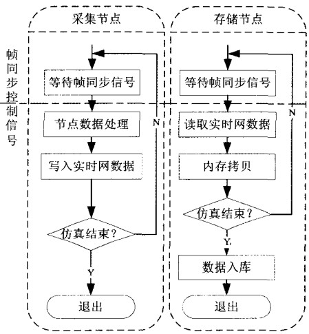 2)通過時間片劃分避免讀寫沖突。由于反射內存機制的特殊性,不同仿真節點有可能同時對同一地址進行操作,發生讀寫沖突。為了避免讀寫沖突問題,在統一幀周期的基礎上進行時間片劃分:在同一幀周期內部,負責數據采集的節點先進行自身的運算處理,在幀周期后半部分采集數據并寫入反射內存網;負責數據存儲的節點則在幀周期前半部分讀取實時網數據,然后進行存儲。通過這種時間片劃分機制,可以避免讀寫沖突,而且不會影響各仿真節點的運行效率。