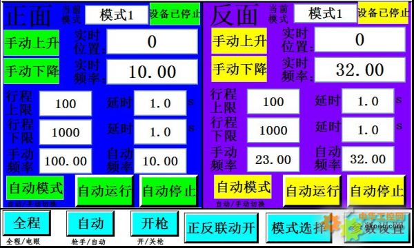 運(yùn)行畫面主要分為正反面兩部分,分別對(duì)應(yīng)兩臺(tái)設(shè)備,因此參數(shù)也是左右對(duì)應(yīng)的。畫面顯示了當(dāng)前往復(fù)機(jī)的實(shí)時(shí)位置和實(shí)時(shí)頻率,以及當(dāng)前的工作模式。程序上允許設(shè)備在運(yùn)動(dòng)過(guò)程中進(jìn)行行程上/下限、延時(shí)、頻率的修改。每一次切換手動(dòng)/自動(dòng)模式設(shè)備自動(dòng)回原點(diǎn),等待命令。畫面底部的正反聯(lián)動(dòng)按鈕用來(lái)開啟/關(guān)閉兩臺(tái)設(shè)備的聯(lián)動(dòng)模式,開啟聯(lián)動(dòng)模式倆設(shè)備同步工作。