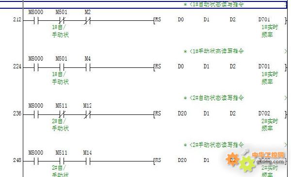 通訊區(qū)主要是PLC通過(guò)走M(jìn)ODBUS協(xié)議跟兩臺(tái)變頻器進(jìn)行通訊,實(shí)現(xiàn)變頻器頻率可在觸摸屏上設(shè)置,以上是modbus通訊參數(shù)的設(shè)置,串口數(shù)據(jù)傳輸以RS指令去實(shí)現(xiàn)。