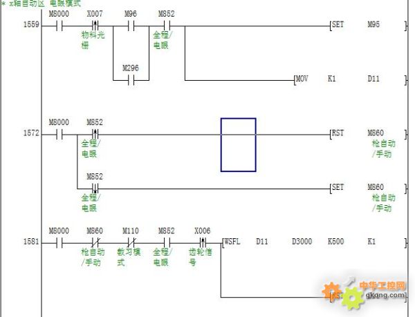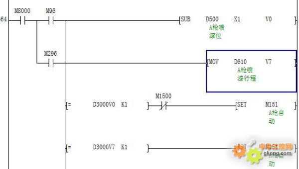 在實(shí)際的控制當(dāng)中,X軸的物料是一個(gè)接一個(gè)過(guò)來(lái)的,而外部的感應(yīng)信號(hào)只有一個(gè)物料接近光柵和齒輪信號(hào),因此當(dāng)有N個(gè)物料經(jīng)過(guò)光柵之后系統(tǒng)需要記住每一個(gè)物料此刻所處在的位置,從而實(shí)現(xiàn)噴槍跟隨每個(gè)物料的輪流靠近做出循環(huán)輸出。程序上面分配了500個(gè)地址主要用字偏移指令,每有一個(gè)物料經(jīng)過(guò)光柵就在首地址寫1,每當(dāng)電機(jī)轉(zhuǎn)過(guò)一個(gè)齒數(shù),就將500個(gè)地址存放的數(shù)據(jù)往后偏移一個(gè)地址,例如A槍的噴射起始位是50(齒數(shù)=50),噴射時(shí)間是20(齒數(shù)=70),則我們只需判斷第50個(gè)地址是否等于1來(lái)執(zhí)行A槍的輸出,以及判斷第70個(gè)地址是否等于1來(lái)關(guān)閉噴槍。
