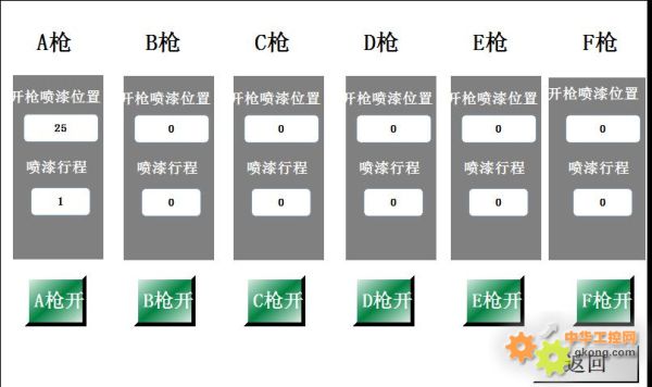 噴槍設(shè)置畫面總共有6把噴槍,可以手動(dòng)設(shè)置每一把噴槍的開槍起始位置和噴射的持續(xù)時(shí)間也可以在教學(xué)模式下自動(dòng)識(shí)別。通過(guò)對(duì)安裝在X軸電機(jī)齒輪邊上的接近開關(guān)進(jìn)行信號(hào)計(jì)數(shù)(齒輪每轉(zhuǎn)動(dòng)過(guò)一個(gè)齒發(fā)一個(gè)信號(hào)),操作員在教學(xué)模式下在當(dāng)物料接近噴槍的時(shí)候點(diǎn)擊開槍,當(dāng)物料離開噴射點(diǎn)的時(shí)候點(diǎn)擊關(guān)槍,系統(tǒng)便能自動(dòng)的記憶住改物料的起始噴槍位置和噴射時(shí)間。