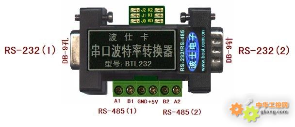 波仕BTL232串口波特率轉換器的外形為DB-9/DB-9轉接盒大小,如圖的產品左邊為DB-9孔的1號RS-232口,左下面為A1、B1的1號RS-485口;右邊為DB-9針的2號RS-232口,右下面為A2、B2的2號RS-485口。產品上邊為波特率設置的跳線,左邊的J2、J1、J0用于設置左邊1號RS-232和RS-485串口的波特率;右邊的K2、K1、K0用于設置右邊2號RS-232和RS-485串口的波特率