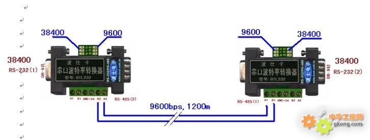 要延長RS-232的距離可以將其轉換為RS-485,RS-485可以在9600bps波特率時傳輸最遠1200米,波仕的增強型RS-232/RS-485轉換器可以在9600bps時最遠到1800米。但是增加波特率后傳輸距離大大減小。波仕電子的通信測試結果表明:RS-485在大于9600bps時,最遠傳輸距離大致與波特率成反比,而減小波特率也幾乎無助于增加通信距離。而且在大于9600bps波特率的遠程通信時,必須根據通信距離來增加導線直徑以及終端電阻。如何在高于9600bps波特率時實現高速遠程傳輸,比如要在38400bps時傳輸1200米。擅長于RS-232/RS-485通信的波仕電子總不乏驚世之作。在RS-485遠程方面,波仕曾經借鑒了以太網自動100M/10M速率適應的技術研發出業界首款RS-232/485波特率轉換器BTL232,開創了RS-232/485通信的新方式。BTL232一直保持著業界最小RS-232/485波特率轉換器的記錄。現在要介紹如何用這款波特率轉換器來實現RS-232/RS-485的高速遠程傳輸。