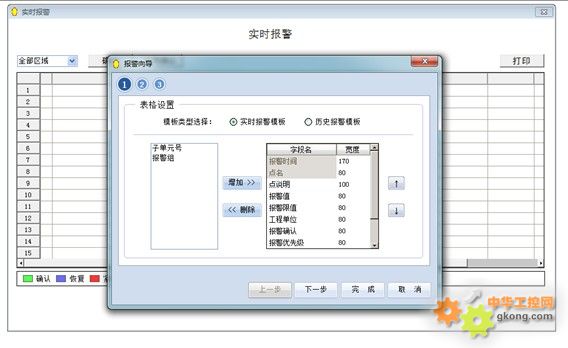 第1步為表格設置,包括模板類型設置和顯示字段設置。模板類型為2種:實時報警、歷史報警。顯示字段中包括可以顯示的所有內容,用戶可以根據需要選擇,并可以設置顯示的寬度。如下圖所示: