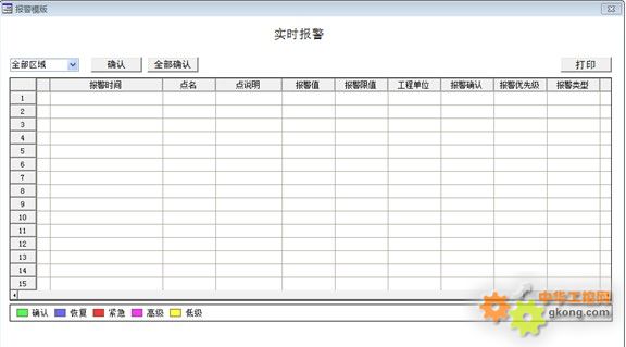 實時報警包括:區域選擇、報警確認、打印、報警顯示、背景顏色圖例和查詢異常顯示。