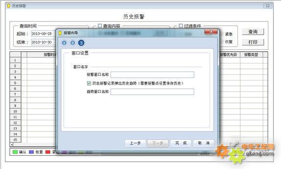 第3步為窗口設置,可以設置最終生成窗體的窗體名。窗口名稱不能與當前工程中其他窗體重名。對于實時報警,最終只生成一幅窗體;對于歷史報警,如果用戶選擇“雙擊報警記錄彈出歷史趨勢”,則最終生成2幅窗體,否則生成一幅窗體。