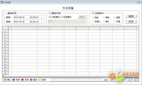 歷史報警包括:查詢時間、查詢內容、過濾條件。