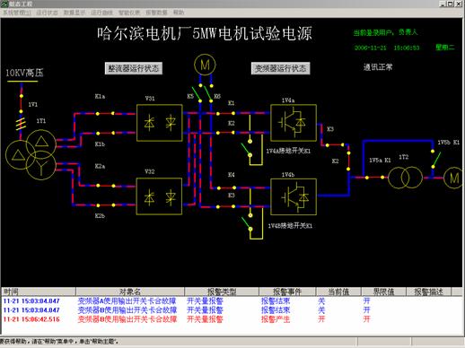 系統(tǒng)采用網(wǎng)絡(luò)控制技術(shù),通過profibus-DP協(xié)議與各個(gè)子系統(tǒng)的現(xiàn)場(chǎng)控制器相連接,整個(gè)系統(tǒng)運(yùn)行狀態(tài)用電路圖形的方式形象直觀地顯示在控制室的計(jì)算機(jī)屏幕上(如圖7、圖8所示的本產(chǎn)品應(yīng)用于哈爾濱電機(jī)廠電機(jī)實(shí)驗(yàn)站圖片),系統(tǒng)的參數(shù)設(shè)置和運(yùn)行數(shù)據(jù)也可以通過上位計(jì)算機(jī)輸入和顯示(如圖9),人機(jī)界非常友好。