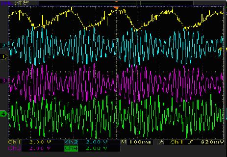 (3)利用一套電源實(shí)現(xiàn)異步電機(jī)空載試驗(yàn)、在空載過程中進(jìn)行的超速試驗(yàn)、在空載過程中進(jìn)行的短時(shí)升高電壓試驗(yàn)、異步電機(jī)堵轉(zhuǎn)試驗(yàn)、異步電機(jī)的疊頻法溫升試驗(yàn)(圖5為試驗(yàn)時(shí)示波器記錄的波形)、同步電機(jī)空載試驗(yàn)、同步電機(jī)在空載過程中進(jìn)行的超速試驗(yàn)、同步電機(jī)在空載過程中進(jìn)行的短時(shí)升高電壓試驗(yàn)。試驗(yàn)電路框圖如圖4所示。