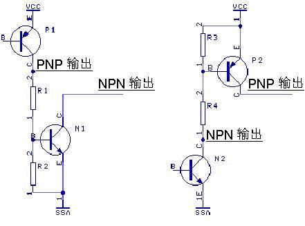 左圖為 PNP 輸出轉(zhuǎn)換為 NPN 輸出,右圖為 NPN 輸出轉(zhuǎn)換為 PNP 輸出,均為集電極開(kāi)路形式。其工作原理不在此詳述。