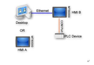 透過以太網絡,PC與HMI可以操作連接在其它HMI上的PLC;舉例來說,假設現有一臺三菱PLC連接到HMI B的COM 1,當PC或HMI A欲讀取此臺PLC上的數據,則PC端或HMI A上所使用工程檔案設定步驟如下: