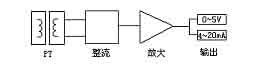 交流信號(hào)又分為交流電壓和電流信號(hào)。,圖1為交流電流信號(hào)的檢測(cè)原理框圖,圖2為交流電壓信號(hào)的檢測(cè)原理框圖,由CT和PT對(duì)信號(hào)進(jìn)行隔離,電流為穿孔輸入方式,電壓為端子接線輸入方式。