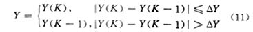 限幅濾波把兩次相鄰的采樣值相減,求出其增量(以絕對值表示),然后與兩次采樣允許的最大差值(由被控對象的實際情況決定)ΔY進行比較,若小于或等于ΔY,則取本次采樣值;若大于ΔY,則仍取上次采樣值作為本次采樣值。即: