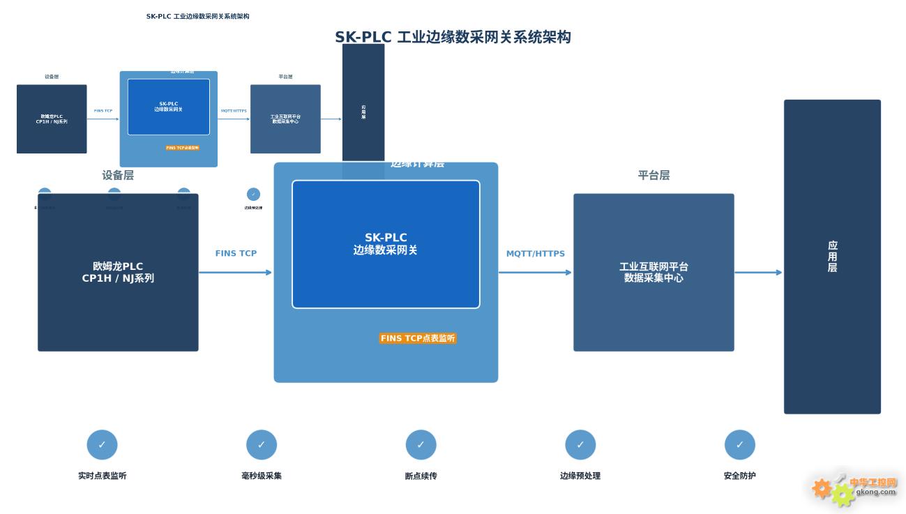 在客戶的智能工廠項目中, SK-PLC網關部署于車間邊緣計算節點,形成了 " 設備層 — 邊緣層 — 平臺層 — 應用層 " 的四層架構體系。設備層通過 FINS TCP 與 48 臺歐姆龍 PLC 建立通信連接;邊緣層的 SK-PLC 網關承擔數據采集、預處理和協議轉換的核心職責;平臺層通過 MQTT/HTTPS 協議接收標準化后的數據;應用層則面向 MES 、 ERP 、質量追溯等上層業務系統提供數據服務。