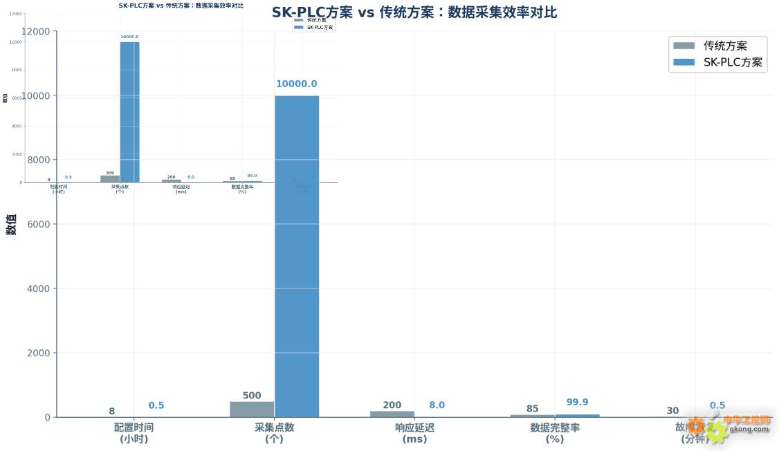 從上圖的量化對比可以清晰看出, SK-PLC方案在各項指標上均實現了數量級的提升。點表配置時間從 8 小時銳減至 0.5 小時,效率提升 16 倍;單網關支持采集點數從 500 個躍升至 10,000 個,滿足大規模部署需求;數據響應延遲從 200 毫秒降至 8 毫秒,滿足實時控制場景要求;數據完整率從 85% 提升至 99.9% ,為精準分析奠定了堅實基礎;故障自動恢復時間從 30 分鐘縮短至 30 秒,大幅提升了系統可用性。
