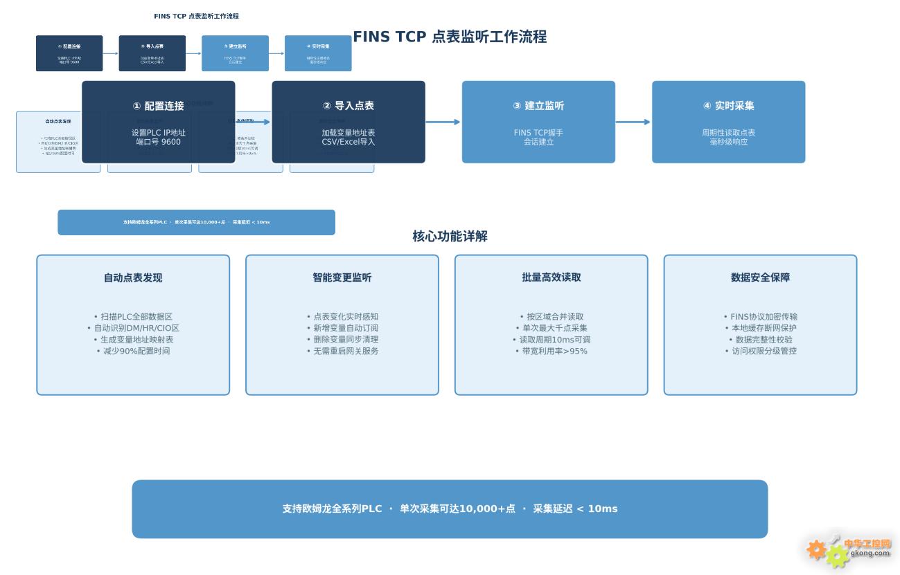 如上圖所示,整個工作流程分為四個核心步驟:首先是配置 PLC連接參數( IP 地址、端口號 9600 );其次是導入或自動發現變量點表;第三步建立 FINS TCP 監聽會話;最后進入實時采集循環。 SK-PLC 的四大核心功能模塊 —— 自動點表發現、智能變更監聽、批量高效讀取和數據安全保障 —— 確保了整個流程的高效穩定運行。