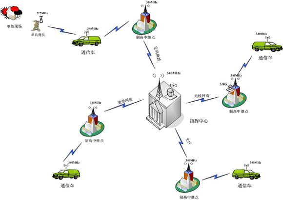 指揮車通過(guò)大功率無(wú)線移動(dòng)發(fā)射設(shè)備將城區(qū)四周的制高點(diǎn),制高點(diǎn)作為系統(tǒng)的信號(hào)轉(zhuǎn)發(fā)站,制高點(diǎn)通過(guò)無(wú)線移動(dòng)接收設(shè)備將指揮車上的視音頻信號(hào)接收后,再通過(guò)音視頻電纜送到視頻編碼器轉(zhuǎn)化成網(wǎng)絡(luò)數(shù)字信號(hào),然后信號(hào)再通過(guò)網(wǎng)絡(luò)雙絞線送入到無(wú)線網(wǎng)橋,制高點(diǎn)的無(wú)線網(wǎng)橋?qū)⑷啃盘?hào)發(fā)射到指揮中心,到達(dá)指揮中心的MPEG2數(shù)字信號(hào)即可以轉(zhuǎn)換成模擬信號(hào)在大屏幕顯示輸出,也可以通過(guò)網(wǎng)絡(luò)直接在網(wǎng)絡(luò)中進(jìn)行傳輸,用戶經(jīng)過(guò)授權(quán)后可通過(guò)控制軟件在網(wǎng)絡(luò)上任何一臺(tái)電腦上進(jìn)行顯示。指揮中心還可通過(guò)網(wǎng)絡(luò)等有線或無(wú)線方式將視音頻傳輸?shù)街ш?duì)相關(guān)領(lǐng)導(dǎo)及市政府相關(guān)單位。