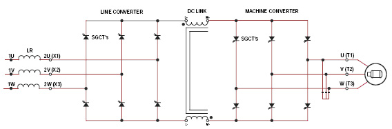摘 要: 羅克韋爾PowerFlex7000變頻器在九洲中壓變頻實驗站測試系統中作為變流逆變器使用,由于本身屬于電流源型變頻器,具有四象限運行功能,能夠實現能量的回饋和對電機的制動,先進的矢量控制技術,可以實現各種復雜多變的負載特性,在模擬電機負載方面起到了其他變頻器無可替代的作用,實現了變頻器出廠之前的滿負荷測試。 關鍵詞: PowerFlex7000,電流源型,矢量控制,能量回饋 Application of Rockwell medium voltage drive in JiuZhou Electric medium voltage drive test bay YU MING TAO (Haerbin JiuZHou electric ,Heilongjiang Haerbin 150081) ABSTRACT: A Rockwell PowerFlex7000 Variable Frequency Drive is used in JiuZHou Electric medium voltage drive test bay as the converter. Because of it belong to the current source drive, it has the function of the four quadrant, it can achieve the energy feedback and make the motor brake, and also has the advanced vector control technology, so it can achieve all kinds of load test, there are no other drives can replace it in simulate motor load. PowerFlex7000 drive has ability to achieve the full load test before the drive leave factory. Key words: PowerFlex7000, Current Source Type, Control by vector, energy feedback 1 引言 隨著經濟的飛速發展,能源問題日益成為越來成為人們最關心的問題,能源分可再生資源和非可再生資源,當非可再生資源越來越短缺的時候,如何節約能源,便是當前最需解決的問題。當前工業用電成本不斷加大,為了降低成本,調速設備在工廠中得到了廣泛的應用,伴隨著技術的不斷成熟,變頻調速設備在工業中倍受歡迎,由此在變頻器市場引發的競爭是日益激烈,特別是在中壓變頻器的市場競爭更加殘酷。如果誰能夠在市場競爭中占據一定的優勢,那么誰就能笑到最后。 哈爾濱九洲電氣與美國羅克韋爾公司合作共同建立了亞洲最大的中壓變頻實驗基地——哈爾濱九洲中壓變頻實驗站,能夠完全實現中壓變頻器出廠前的滿載測試,滿足不同用戶的實際需求。哈爾濱九洲變頻實驗站采用的是羅克韋爾自動化公司生產的PowerFlex7000型中壓變頻器作為實驗站主體,實現中壓變頻器在出廠前模擬現場完成滿負荷帶載測試。有效的保證了變頻器的質量。 2 PowerFlex7000型變頻器的結構與特點 2.1 PowerFlex7000型變頻器電路結構 PowerFlex7000是羅克韋爾自動化公司的第三代中壓變頻器。它的PowerFlex系列變頻器融合了先進的技術,嵌入了通信功能,在多平臺、網絡、操作員界面編程和硬件方面具有強大的通用性。PowerFlex 7000是通用的獨立式中壓變頻器,可以控制標準的同步或異步交流電動機的速度、轉矩、方向、起動和停機。它適用于廣泛的標準和特殊應用如風機、泵、壓縮機、攪拌機、輸送機、窯爐、風扇式泵和試車臺。這些應用的主要行業包括石油化工、水泥、采礦和冶煉、發電和供水/廢水處理。 PowerFlex7000型變頻器不同于世界上其他廠家生產的中壓變頻器,它是世界上唯一的電流源型中壓變頻器,根據電流源型變頻器的技術特點,它很容易實現四象限運行,比電壓源型變頻器控制更加簡單,可靠。電機可以正反方向以電動機或發電機方式運行,當電機以發電機工作方式時,能量可回饋電網,再生制動,這就為九洲中壓變頻實驗站進行滿負荷測試實驗提供了可能。 PowerFlex7000型變頻器屬于電流型中壓變頻器,它具有結構簡單,元器件數量少,四象限運行,同時具有矢量控制功能等特點。圖1中所示的是PWM控制方式的無輸入變壓器的電流型變頻器的電路拓撲結構圖。
