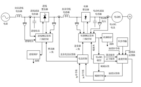 圖1 電流型變頻器電路拓撲圖 電路結構為交-直-交型,功率器件采用對稱門極換流晶閘管(SGCT),對于6KV電壓等級的變頻器,每個橋臂采用3只耐壓為6500V的SGCT串聯,具有IGBT的全部優點,并能阻斷雙方向的電壓,減少使用器件的數量,使驅動和吸收電路進一步簡化,性能更加優越。 2.2 PowerFlex7000型變頻器的工作原理 PowerFlex7000型變頻器電路部分,分為高壓主回路部分和低壓控制回路部分。高壓主回路功率單元部分也分兩部分,整流側(Rectifiers)和逆變側(INVERTER)。三相6000V進線電源首先經過 AC LINE REACTOR (進線交流電抗器),進線側交流電抗器可以提供額外的濾波功能和電流限制特性防止發生進線短路故障。然后進入整流側,整流側是由SGCT或SCR(對于18脈沖)組成的整流器將交流變為直流,在經過直流電抗器(DC LINK )到逆變側,通過脈寬調制方式,將直流變成交流,再通過電機側濾波電容進行濾波,將近乎完美正弦電流電壓波形輸出到電機。低壓控制回路部分包括顯示操作界面,低壓電路,各種控制電路板,不間斷電源(UPS)等。 PowerFlex7000變頻器是通過控制電機的轉矩來控制電機速度的,通過計算和測量電機速度,并按要求調整轉矩使被測速度等于速度命令。電機和負載決定了定子頻率并使變頻器與電機同步,這與大多數V/F控制的交流變頻器形成了對照,V/F控制的變頻器是變頻器決定定子頻率并且不能使輸出與電機同步。PowerFlex7000的控制方式是直接矢量控制。術語矢量控制表明定子電流矢量的位置是相對于電動機磁通矢量而控制的。直接矢量控制意味著電機磁通可以測量,這與多數通用的間接矢量控制不同,間接矢量控制中電機的磁通是估算的。兩種控制算法中,定子電流( )被分解為可以獨立控制的磁通分量 和 正交轉矩分量 ,矢量控制的目的就是獲得與直流電動機相似的性能,可以快速改變轉矩而不影響磁通。 圖2 為 powerflex7000控制系統功能塊圖。