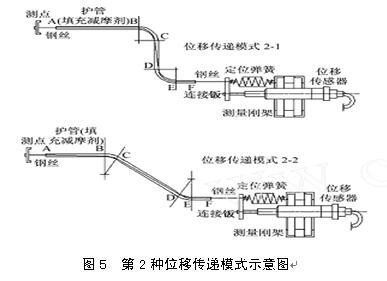 但是全部護(hù)管采用整根的外徑3mm的不銹鋼管經(jīng)特殊方法彎曲而成,內(nèi)置可以彎曲的直徑0.5mm的彈簧鋼絲,二者之間采用涂抹硅膠的方式減少摩擦這樣,從測(cè)點(diǎn)的固定端到測(cè)頭傳感器的整個(gè)傳遞路徑就只有一根連續(xù)的鋼絲,不需要任何接頭。由于鋼絲較柔軟,所以這時(shí)整個(gè)傳遞系統(tǒng)只可以傳拉,不可以傳壓,因而也就只能量測(cè)單方向的位移。為了解決這一問題,我們?cè)跍y(cè)頭傳感器連接鈑與測(cè)量鋼架之間,增加了一根張力彈簧。在傳感器的正負(fù)量測(cè)范圍內(nèi),無論測(cè)點(diǎn)正向還是反向變形,均可以使鋼絲中保持一定張力而拉緊,并帶動(dòng)傳感器連接鈑的移動(dòng)。對(duì)第二種傳遞模式中AB段的長(zhǎng)度設(shè)計(jì)同樣考慮了與第一種傳遞 模式相同的因素:第一AB段長(zhǎng)度不宜小于50cm,第二AB段長(zhǎng)度大于2~3倍的洞室的跨度。 模式2-1與2-2差別不大,模式2-2在弧段長(zhǎng)度上有所減少,相應(yīng)減少了摩擦力,位移傳遞靈敏度有所增加,但增加了傳遞的總長(zhǎng)度。