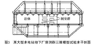 例如在上述地下廠房洞群三維地質(zhì)力學(xué)模型試驗(yàn)中,沿開挖面法線方向的每組三個(gè)測(cè)點(diǎn)的位置分別距離開挖邊界1、5和20m(模型中為1、5和20cm),而模型外邊界則距離開挖邊界在250~300cm左右。由于測(cè)點(diǎn)處的位移值傳到多點(diǎn)位移計(jì)測(cè)頭采用了直線傳遞方式,這樣就會(huì)使得內(nèi)部位移量的傳遞距離遠(yuǎn)達(dá)2.5~3m左右。它會(huì)引起如下問題: 增加多點(diǎn)位移計(jì)測(cè)桿和護(hù)管的長(zhǎng)度,需多根測(cè)桿和護(hù)管相連接,降低連接可靠度和位移傳遞精度;增加測(cè)桿和護(hù)管間的摩擦力,降低位移傳遞靈敏度測(cè)桿和護(hù)管穿過較大范圍模型材料,干擾模型的制作;反之又增加模型制作過程中對(duì)多點(diǎn)位移計(jì)破壞的可能性。 針對(duì)上述問題和不足,本文提出如下改進(jìn)位移傳遞模式的設(shè)想。即提出了“直線傳遞與曲線傳遞相結(jié)合,柔性連接與剛性連接相結(jié)合”的新思路,設(shè)計(jì)了兩種新的位移傳遞模式,并試制了相應(yīng)傳遞系統(tǒng)。2 新型位移傳遞模式設(shè)計(jì) [8] 2.1 新型位移傳遞模式的設(shè)計(jì)思想 新型位移傳遞模式的設(shè)想是出于以下考慮,即在三維模型中能否選擇較短的路徑將內(nèi)部位移值傳遞到模型外部?回答是可能的。因?yàn)闇y(cè)點(diǎn)并非到模型的任何邊界的距離都是一樣的遠(yuǎn),總是有遠(yuǎn)有近的。例如在某大型地下廠房洞群三維模型試驗(yàn)中,在量測(cè)端面上,主廠房上游邊墻處的測(cè)點(diǎn)到模型上游方向最外邊界約2.5m,而同一個(gè)測(cè)點(diǎn)到最近的模型邊界(地下廠房中間機(jī)組中心線斷面)距離僅有約20cm,見圖3。由于要量測(cè)垂直于洞軸線方向的位移,按照直線傳遞模式就只能將測(cè)頭放置到最遠(yuǎn)的模型邊界處。要改變這一點(diǎn),讓內(nèi)部位移盡快傳遞到模型外邊,就必須打破位移直線傳遞模式。 解決問題的思路是用曲線傳遞代替直線傳遞,而實(shí)現(xiàn)曲線傳遞則又需要用柔性傳遞代替剛性傳遞。通過實(shí)際設(shè)計(jì)和實(shí)驗(yàn)檢驗(yàn),采用了直線與曲線相結(jié)合,剛性與柔性相結(jié)合的新型位移傳遞模式,既縮短了位移傳遞距離,又保證了傳遞的靈敏度和可靠性。這一設(shè)計(jì)思想在如下的細(xì)部設(shè)計(jì)中得到了體現(xiàn)。