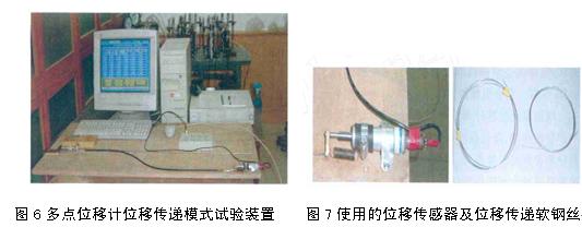 2.3 兩種新型位移傳遞模式的測(cè)試結(jié)果 由于第一種位移傳遞模式的多點(diǎn)位移計(jì)結(jié)構(gòu)遠(yuǎn)較第二種復(fù)雜,需要較麻煩細(xì)致的機(jī)加工,至今尚未制作完成。第二種新型位移傳遞模式微型多點(diǎn)位移計(jì)制作完成后,我們也進(jìn)行了儀器的精度測(cè)試,測(cè)試地點(diǎn)在清華大學(xué)水利水電工程系水工實(shí)驗(yàn)室。分別將兩種不同位移傳遞系統(tǒng)機(jī)構(gòu)與位移傳感器、通道選擇器、KTG-C數(shù)據(jù)采集器、電源穩(wěn)壓器、微機(jī)系統(tǒng)相聯(lián),并固定在試驗(yàn)臺(tái)上。測(cè)點(diǎn)端部用螺旋測(cè)微計(jì)作為標(biāo)準(zhǔn)位移給定,另一端與傳感器測(cè)量桿平行并接。見圖6、圖7。