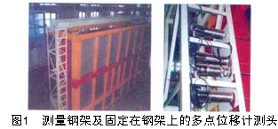 Abstract: The mini-type multi-point extensometer has been used for the displacemen t measurement in a 3D geo-mechanical model test of avery large scaled underground powerhouse group caverns,and good results were obtained.However,the distance of the displacement transfer is very long in some case,it brings difficulty to the model manufacture and the accuracy of the measurement.The design and test of new deformation transfer patterns were introduced.The transfer system errors were analyzed and the formulas were derived for the error modification.Keywords: displacement measurement;transferring patterns;error analysis1 引言 地質(zhì)力學(xué)模型試驗(yàn)是研究邊坡工程、地下洞室工程穩(wěn)定性的一種重要手段[1,2] ,近年來又有新的發(fā)展[3,4] 。微型多點(diǎn)位移計(jì)則是量測(cè)三維巖體模型內(nèi)部物理量的主要儀器。它的最大的優(yōu)越性是可以測(cè)量出邊坡或地下洞室開挖過程的全量位移值。由于儀器埋設(shè)的困難,這一點(diǎn)甚至在實(shí)際工程現(xiàn)場(chǎng)監(jiān)測(cè)中都很難做到。在模型試驗(yàn)中為了達(dá)到這一目的,需要在試驗(yàn)臺(tái)和加載系統(tǒng)之外,再做一個(gè)完全獨(dú)立的具有相當(dāng)剛度的測(cè)量基準(zhǔn)鋼架,這個(gè)基準(zhǔn)鋼架應(yīng)該做到不受試驗(yàn)過程的影響,模型內(nèi)部的變形都是相對(duì)于這個(gè)基準(zhǔn)進(jìn)行測(cè)量的。例如在某大型水電站[5] 地下廠房洞群三維地質(zhì)力學(xué)模型試驗(yàn)中[6,7] ,就是在試驗(yàn)臺(tái)加載鋼架的的外側(cè),又制作了一個(gè)跨度約為8m,高約6m的鋼架,多點(diǎn)位移計(jì)的位移傳感器測(cè)頭就固定在這個(gè)鋼架上(見圖1)。